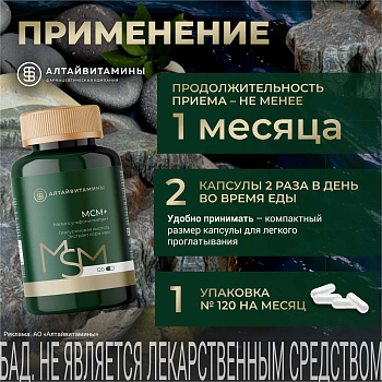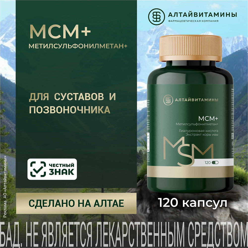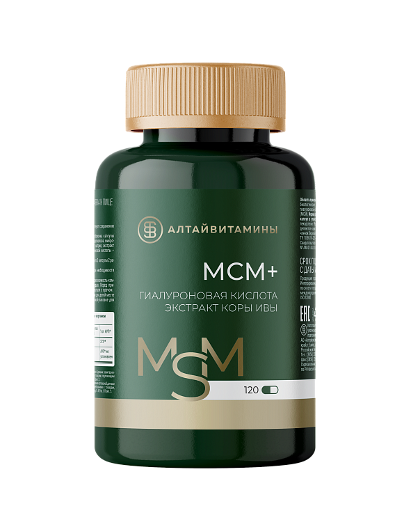 Метилсульфонилметан (МСМ), оболочка капсулы (желатин, диоксид титана краситель), целлюлоза микрокристаллическая – носитель, гиалуронат натрия, экстракт коры ивы белой, кальциевая соль стеариновой кислоты – агент антислеживающий.
