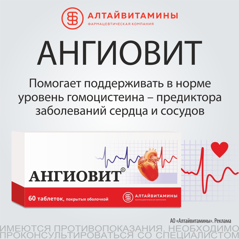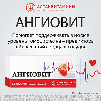 Регулярный прием «Ангиовита» достоверно снижает уровень гомоцистеина и помогает удерживать его в пределах физиологической нормы, защищая сосуды от повреждений и предупреждая развитие сердечно-сосудистых катастроф.