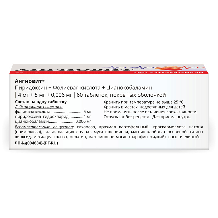 Препарат Ангиовит® показан к применению у взрослых в возрасте от 18 лет: - для профилактики дефицита витаминов, входящих в состав препарата; - при повышенном содержании в плазме крови аминокислоты гомоцистеина (гипергомоцистеинемии).
