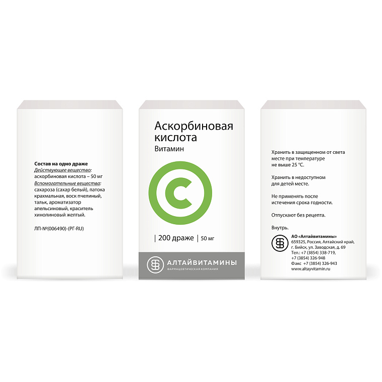 Действующее вещество: аскорбиновая кислота – 50 мг. Вспомогательные вещества: сахароза (сахар белый) – 184,88 мг, патока крахмальная – 14,64 мг, воск пчелиный – 0,10 мг, тальк – 0,27 мг, ароматизатор апельсиновый – 0,06 мг, краситель хинолиновый желтый – 0,05 мг. Масса драже – 250 мг.