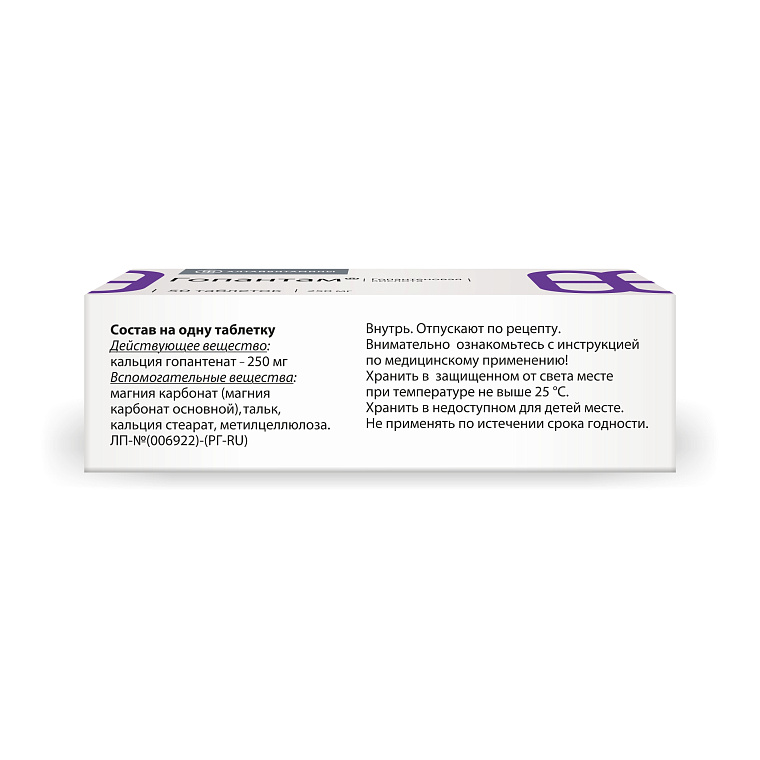 Действующее вещество: кальция гопантенат - 250 мг. Вспомогательные вещества: магния карбонат (магния карбонат основной) - 33,0 мг, тальк - 3,0 мг, кальция стеарат - 9,0 мг, метилцеллюлоза - 15,0 мг. Масса таблетки: 310,0 мг.