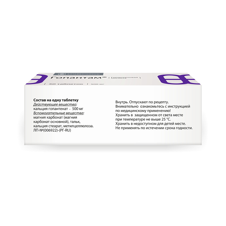 Действующее вещество: кальция гопантенат - 500мг. Вспомогательные вещества: магния карбонат (магния карбонат основной) - 66,0 мг, тальк - 6,0 мг, кальция стеарат - 18,0 мг, метилцеллюлоза - 30,0 мг. Масса таблетки: 620,0 мг.