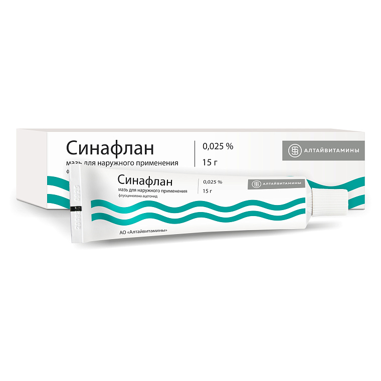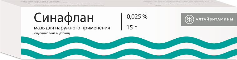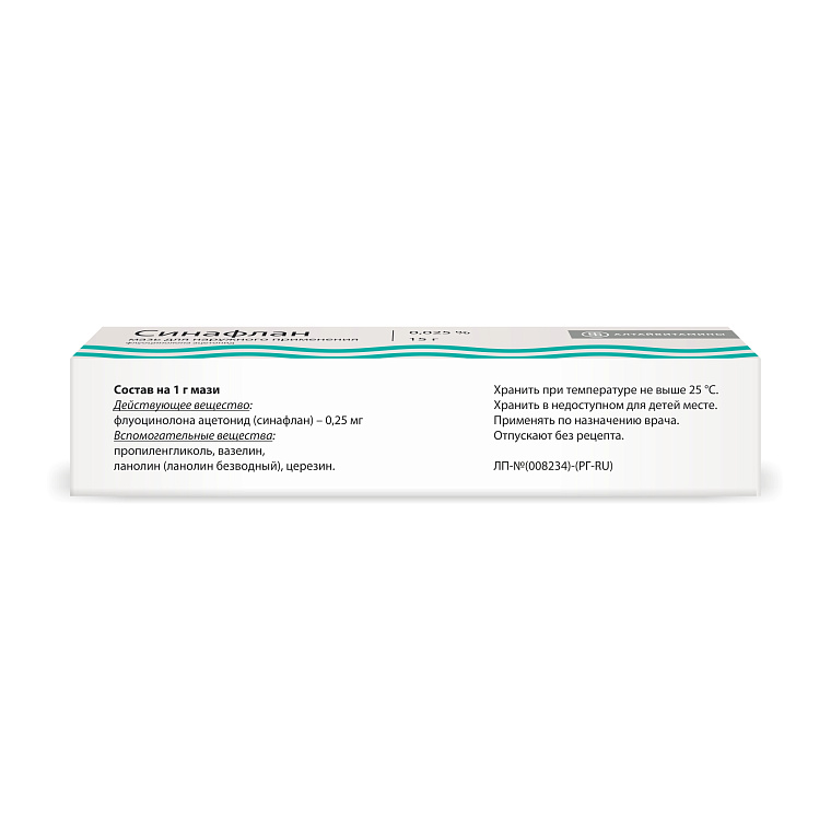 Действующее вещество: флуоцинолона ацетонид (синафлан) − 0,025 г. Вспомогательные вещества: пропиленгликоль − 4,975 г, вазелин − 80,0 г, ланолин (ланолин безводный) − 5,0 г, церезин − 10,0 г.