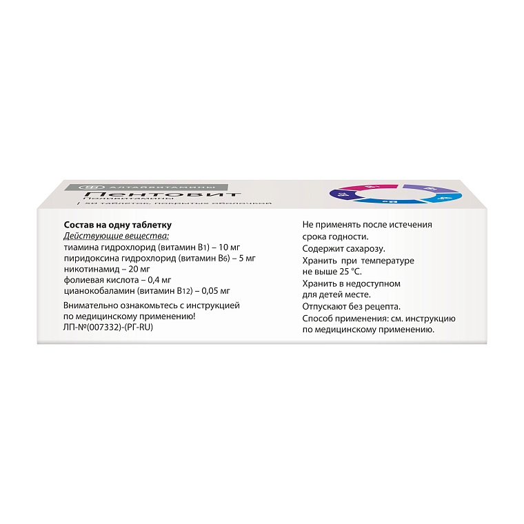Действующие вещества: тиамина гидрохлорид (витамин В1) - 10 мг пиридоксина гидрохлорид (витамин В6) - 5 мг никотинамид - 20 мг фолиевая кислота - 0,4 мг цианокобаламин (витамин В12) - 0,05 мг Вспомогательные вещества для получения таблетки-ядра массой 0,20 г: сахароза - 111,000 мг кроскармеллоза натрия (примеллоза) - 8,000 мг тальк - 3,000 мг кальция стеарат - 2,000 мг крахмал картофельный - 40,550 мг Вспомогательные вещества для получения оболочки массой 0,14 г: сахароза - 67,50 мг воск пчелиный - 0,17 мг тальк - 0,10 мг магния карбонат основной - 25,67 мг мука пшеничная - 37,44 мг метилцеллюлоза - 0,67 мг желатин - 0,36 мг парафин жидкий (вазелиновое масло) - 0,17 мг титана диоксид [E171] - 7,92 мг Масса таблетки - 0,34 г