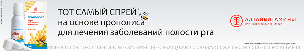 ПРОПОСОЛ – проверенное временем лекарство для лечения всех основных заболеваний полости рта. Спрей борется с бактериями, инфекцией, восстанавливает слизистую и назначается даже при хронических формах заболеваний.
