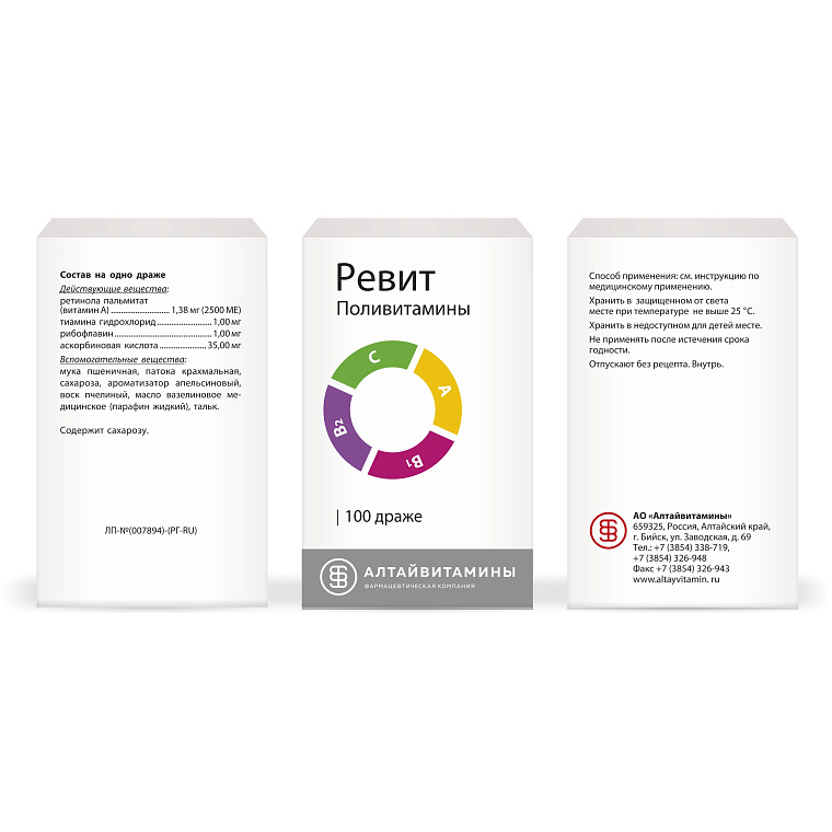 Действующие вещества: ретинола пальмитат (витамин А) – 1,38 мг (2500 МЕ), тиамина гидрохлорид – 1,00 мг, рибофлавин – 1,00 мг, аскорбиновая кислота – 35,00 мг, Вспомогательные вещества: мука пшеничная – 27,47 мг, патока крахмальная – 28,57 мг, сахароза – 404,56 мг, ароматизатор апельсиновый – 0,07 мг, воск пчелиный – 0,13 мг, парафин жидкий – 0,13 мг, тальк – 0,69 мг. Масса драже – 500,00 мг.