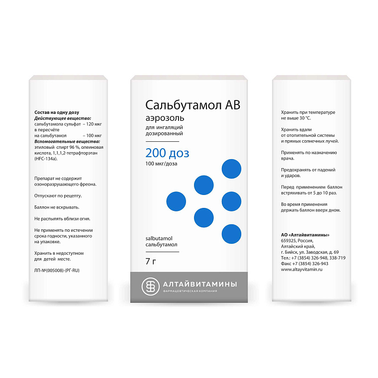 Препарат Сальбутамол АВ применяется у взрослых и детей в возрасте от 2 лет и старше при следующих заболеваниях: бронхиальная астма: купирование симптомов бронхиальной астмы при их возникновении; предотвращение приступов бронхоспазма (сужение просвета бронхов), связанных с воздействием аллергена или вызванных физической нагрузкой; применение в качестве одного из компонентов при длительной терапии бронхиальной астмы на фоне терапии ингаляционными глюкокортикостероидами; другие хронические заболевания легких, сопровождающиеся обратимой обструкцией дыхательных путей (сужением просвета дыхательных путей), включая хроническую обструктивную болезнь легких (ХОБЛ).